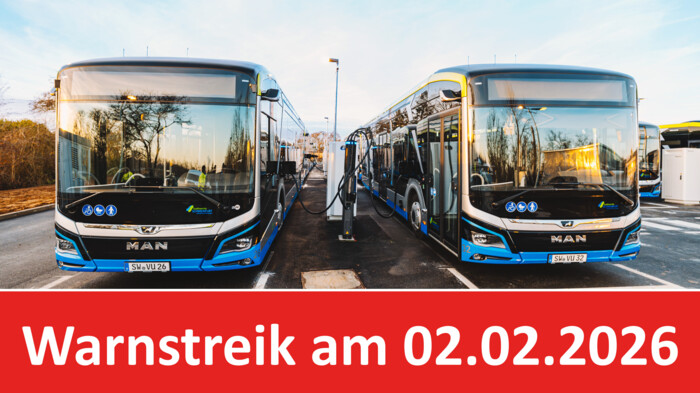 Für Montag, den 2. Februar 2026, hat die vereinte Dienstleistungsgewerkschaft (ver.di) kurzfristig zum bundesweiten Warnstreik im ÖPNV aufgerufen. Der Streikaufruf betrifft auch die Beschäftigten der Stadtwerke Schweinfurt GmbH im Verkehrsbetrieb. Entsprechend ist zu erwarten, dass der Stadtbusverkehr in Schweinfurt größtenteils zum Erliegen kommt. Davon betroffen ist insbesondere auch der Schülerverkehr. Fahrgäste werden daher gebeten, auf alternative Beförderungsmöglichkeiten auszuweichen.