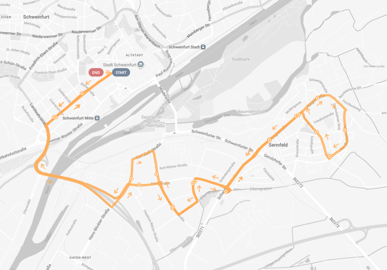 - Alternativ kann die Haltestelle Sennfelder Bahnhof oder die Linie 145 ab Roßmarkt genutzt werden.
