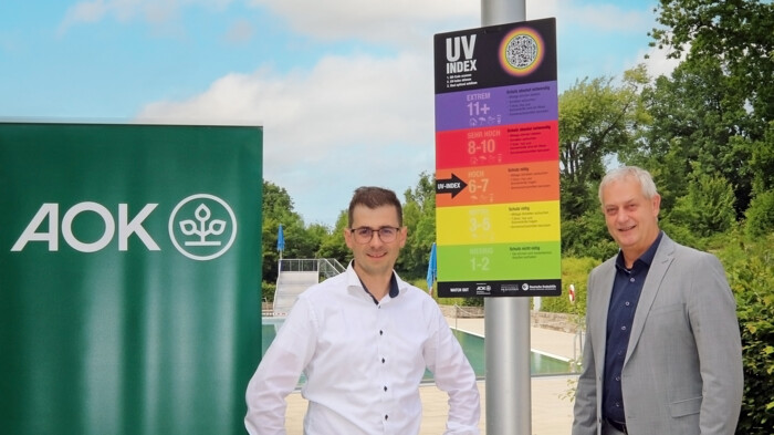 "Bereits ein schmerzhafter Sonnenbrand ist ein deutliches Alarmsignal der Haut. Doch so weit sollte es am besten gar nicht kommen", betont Frank Dünisch, Direktor der AOK Schweinfurt. Entsprechend gibt nun pünktlich zum Start in die Freibadsaison die Infotafel im SILVANA mit einer Farb- und Zahlenskala Empfehlungen für den Sonnenschutz je nach Hauttyp und UV-Index. Eine Markierung zeigt die aktuelle UV-Strahlung an und wie lange man sich ohne Sonnenschutz in der Sonne aufhalten kann, ohne Schädigungen davonzutragen. Neben der Visualisierung der UV-Strahlung auf Grundlage der Daten des Deutschen Wetterdienstes und des Bundesamts für Strahlenschutz bietet ein integrierter QR-Code die Möglichkeit, direkt auf den aktuellen Indexwert und weitere Informationen des Projekts "Watch out at the beach" der Arbeitsgemeinschaft Dermatologischen Prävention e.V. und der Deutschen Krebshilfe zuzugreifen.