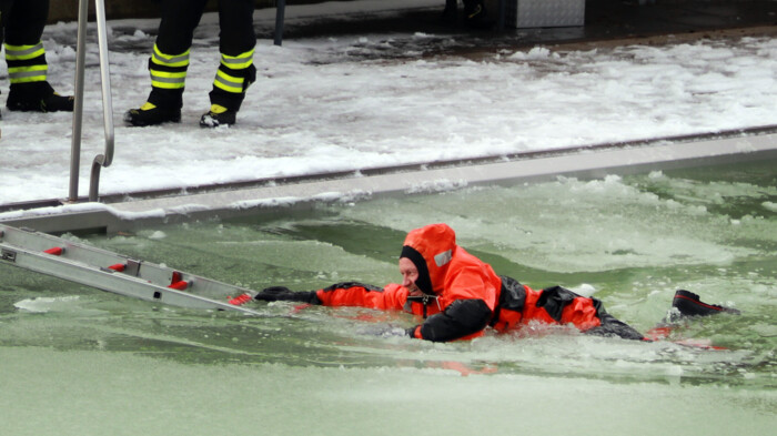 Die Eisrettung bildet einen Teil der Ausbildung und kann am besten bei entsprechenden Witterungsbedingungen durchgeführt werden. Angesichts der Temperaturen Anfang Dezember mit Frost und der dadurch gefrorenen Wasseroberfläche stellten die Außenbecken des SILVANA hierfür das ideale Übungsareal dar.